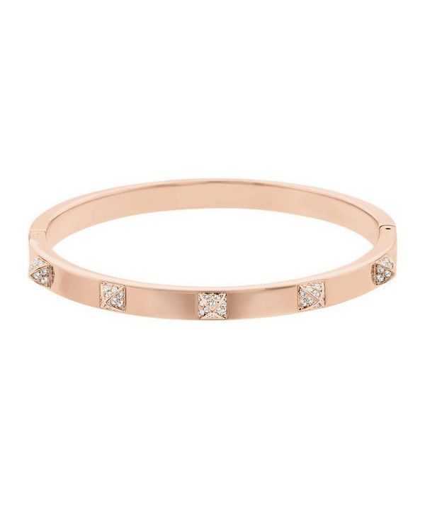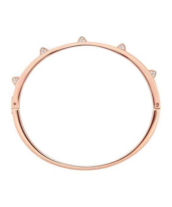 Features Rose Gold Tone Plated Metal, Pyramid Spikes, White Crystals On Bangle, Clear Crystal Pave