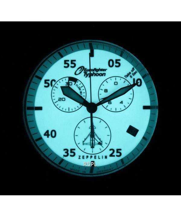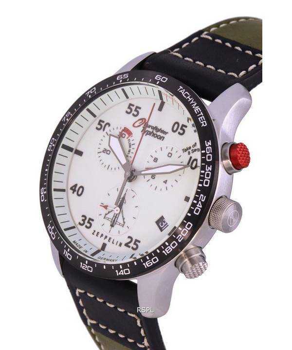 Zeppelin Eurofighter Chronograph Leather Strap Beige Dial Quartz 7298-5 72985 100M Men’s Watch The zeppelin eurofighter automatic chronograph is a statement watch in terms of its functionalities; its sporty design and its stately appearance. The eurofighter embodies the values of a true aviator that turns it into a timeless pilot’s watch. It never fails to impress or perform unless it’s in space or under more than 100m underwater. The red accents on the dial and the chrono start/stop pusher ensure you never miss it under demanding conditions.
